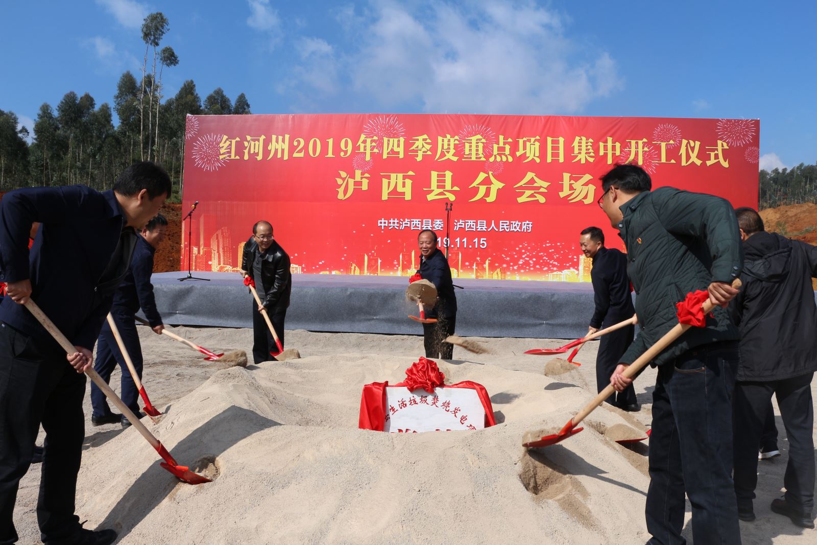 2019年11月15日10:58,瀘西縣生活垃圾焚燒發電項目開工奠基儀式隆重舉行。瀘西縣縣委書記王家林攜縣四大班子、縣各局委班子、縣各鄉鎮班子,瀘西海創總經理張俊杰率硯山海創、瀘西海創班子成員及各參建單位代表參加了奠基儀式。奠基儀式由瀘西縣縣長莫偉主持。