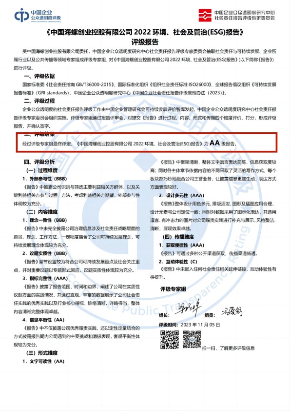 近日,第六屆中國國際進口博覽會在上海舉行。作為博覽會的配套活動,工業和信息化部、司法部等有關部門聯合主辦了“法治護航制造業高質量可持續發展國際論壇",并在會上集中發布了“2023工信千家優秀企業社會責任報告”,《中國海螺創業控股有限公司2022環境、社會及管治(ESG)報告》成功入選并獲評信用評級AA級,為此次報告評級體系九個等級中的第二等級!