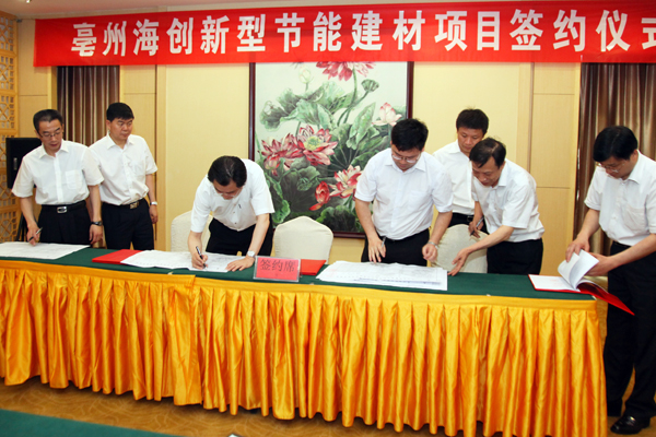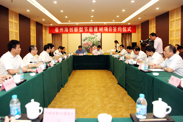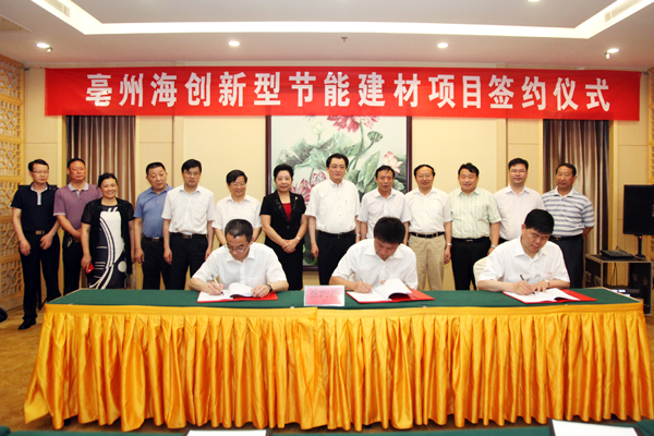 ??? 2013年6月26日下午,亳州海創(chuàng)新型節(jié)能建材項目投資協(xié)議簽約儀式在亳州賓館舉行。亳州市委常委、亳蕪現(xiàn)代產(chǎn)業(yè)園管委會主任金春龍,副市長王崧,海創(chuàng)公司副總經(jīng)理李劍,就亳州海創(chuàng)新型節(jié)能建材項目進行簽約。