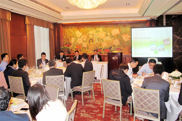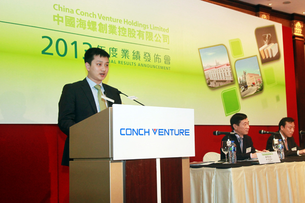 ??? ?2014年4月1日,海螺創業在香港港島香格里拉酒店舉行2013年業績發布會,公司董事長郭景彬、執行董事兼總經理紀勤應、公司秘書疏茂、財務部副部長陳興強等參加會議。這是海螺創業自去年12月19日上市后首次召開業績發布會,倍受市場關注,近138名投資者及分析員參加了會議,現場座無虛席,會場氣氛熱烈而隆重。