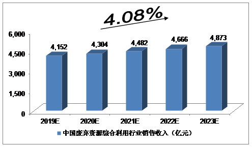 ? ? 我們預(yù)計(jì),2019年我國(guó)廢棄資源綜合利用行業(yè)銷售收入將達(dá)到4,152億元,未來(lái)五年(2019-2023)年均復(fù)合增長(zhǎng)率約為4.08%,2023年將達(dá)到4,873億元。