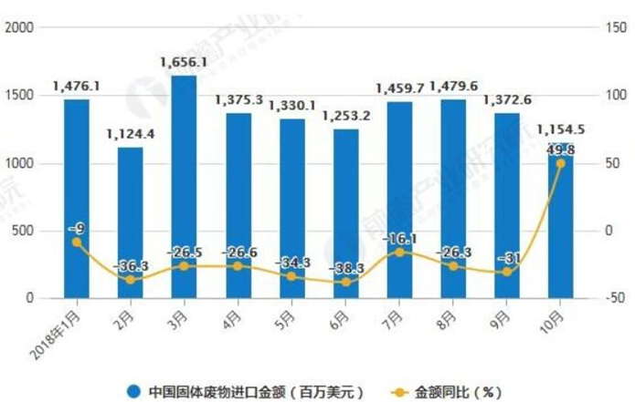 ? ? 在進(jìn)口金額方面,2018年8-9月中國(guó)固體廢物進(jìn)口金額下降,2018年10月中國(guó)固體廢物進(jìn)口金額維持下降趨勢(shì)。2018年10月中國(guó)固體廢物進(jìn)口金額為1155百萬美元,同比增長(zhǎng)49.8%。