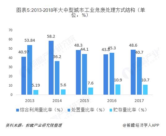 ? ? 從處理方式來看,綜合利用逐漸成為大中型工業危廢的主要處理方式,工業危廢綜合利用量比例由2013年的40.97%上升至2017年的48.6%;處置量比例由2013年的53.84%下降至2017年的40.7%。