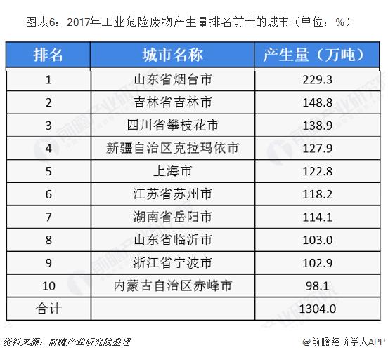 ? ? 從地區上來看,2017年工業危廢排名前十的城市共計產生工業危廢1304萬噸,占全部信息發布城市產生總量的32.5%。排名前三的分別為山東省煙臺市、吉林省吉林市和四川省攀枝花市,產生量分別為229.3萬噸、148.8和138.9萬噸。與一般工業固廢不同的是,山東省工業危廢產生量較多,在前十城市中占據兩席;西部地區入榜反而較少,主要原因為西部工業以一般工業為主,沿海地區工業結構偏向高端制造。