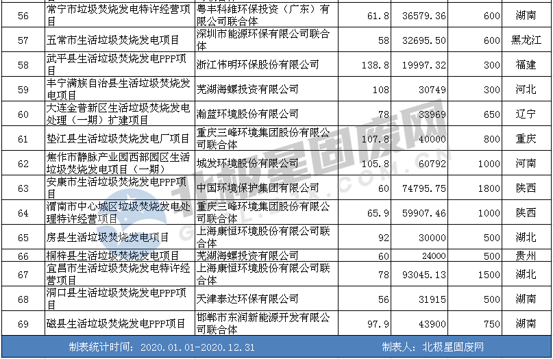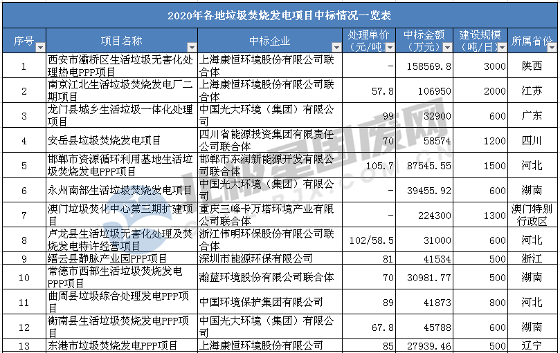 北極星垃圾發電網匯總了2020年各省、市、自治區部分垃圾焚燒發電項目中標情況,主要數據來源中國政府采購網以及省級政府采購網,如有遺漏,敬請諒解,如下表所示(僅供參考):