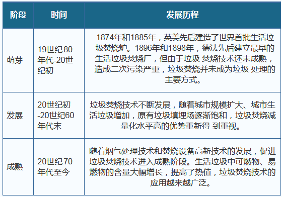 ? ? 我國垃圾焚燒發電行業起步于20世80年代末,通過引進國外先進的焚燒設備和技術,消化吸收優化后步入了較為成熟的發展階段。