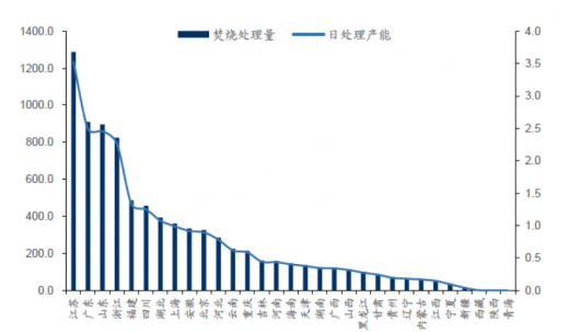 2017年全國各省生活垃圾焚燒量(萬噸)及日處理產能(萬噸/日)