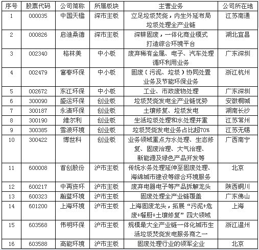 ? ? 在環保各子行業中,固廢處理行業具有投入大、周期長、回報穩定的特點。本人對A股16家固廢處理行業上市公司進行了整理,具體公司情況如下表: