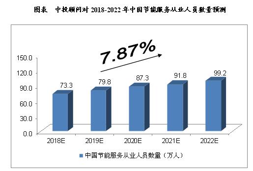綜合以上因素,我們預計,2018年我國節(jié)能服務從業(yè)人員數(shù)量將達到73.3萬人,未來五年(2018-2022)年均復合增長率約為7.87%,2022年將達到99.2萬人。