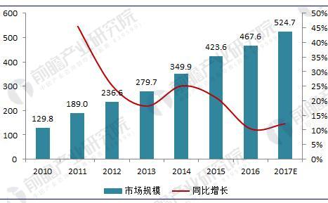 圖表2:2010-2017年我國污泥處理市場規模變化趨勢圖(單位:億元,%)